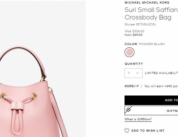 | 内容: | 网站需在境外网络环境下打开! Michael Kors美国官网的这款Michael Kors Suri小号皮革水桶包,粉色售价降至$69。美国境内免邮; 这款包包超仙配色,更显精致可爱~ 无论是温柔的浅驼色,优雅的忧郁蓝,还是粉嫩的浅粉色,统统都想把它带回家啊。