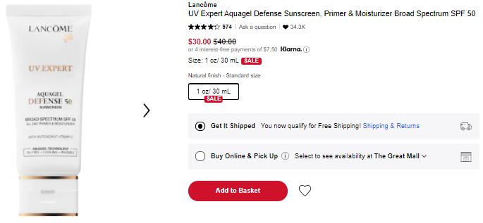 | 内容: | 网站需在境外网络环境下打开! Sephora美国网站的这款LANC?ME 兰蔻防晒霜 spf50 30ml,售价降至75折$30;