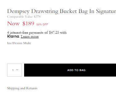 | 内容: | 网站需在境外网络环境下打开! Coach工厂店官网上架了这款Coach 新款 Dempsey Drawstring 丹宁水桶包,售价5折$189,美国境内免邮,转运到手约1350元。 水桶包顾名思义就是外形酷似水桶的包啦,身形圆润又俏皮,是手袋中的经典包型。这款手袋保留了传统外形,又运用了Dempsey系列一贯的提花织布材质拼接鹅卵石牛皮、校队条纹、圆形皮革装饰、抽绳闭合设计等等,整体感觉十分柔软随性又时尚复古随包有附带一条长肩带,手提、斜挎完美互换,总之,好看的包型、十讨喜的
