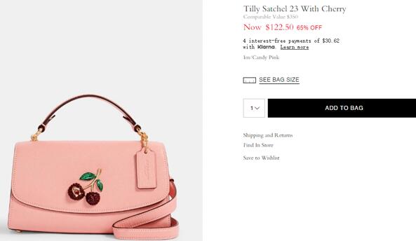 | 内容: | 网站需在境外网络环境下打开! Coach工厂店官网这款新款Coach蔻驰 小号Tilly 23樱桃斜跨包补货,售价35折$122.5,美国境内免运费; Coach蔻驰的这款小号Tilly 23樱桃斜跨包樱桃斜跨包,采用粉嫩的少女颜色,清新可爱,以带有绿叶的樱桃点缀,增加了精致的同时又丰富了包包的色彩,更添一分可爱;