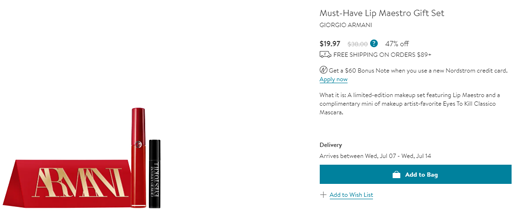 | 内容: | 网站需在境外网络环境下打开! Nordstrom Rack这款Armani阿玛尼唇釉400+旅行装睫毛膏套装,售价降至53折$19.97,约131元。订单满$89美国境内免运费,适合凑单带回,新低价。 这款Armani阿玛尼400套装包含:一支正装400红管唇釉和睫毛膏中样。阿玛尼每个系列的400都是一支好看的正红!也不挑肤色