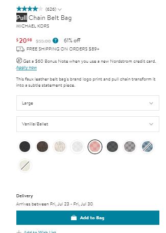 | 内容: | 网站需在境外网络环境下打开! Nordstrom Rack这款Michael Kors Pull Chain老花腰包,粉色售价39折$20.98,目前还参加额外75折(Nordy Club 会员提前入场,免费加入Nordy Club),加入购物车显示折后价,折后价$15.74,订单满$89美国境内免运费,适合凑单回来。 这款腰包,老花的设计,搭上今年最火的腰包风格。配个带皮孔的牛仔裤,短T塞进裤子里好看。 试背图来自网友分享,侵删!