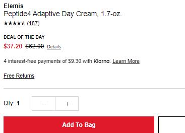 | 内容: | 网站需在境外网络环境下打开! Macy's梅西百货现有精选商品低至5折促销,折后价直接显示在商品页; 其中这款Elemis Peptide4 Adaptive四重肽焕活日霜,售价降至6折$37.2,比上半月价格又降了,需要可关注;美国境内满$25免邮; 艾丽美的四重肽焕活日霜,揭开好气色的秘密。这款多功效日常保湿产品可令暗沉和缺水肌肤重焕活力,保湿的同时帮助肌肤为后续化妆做好准备;还可遮盖瑕疵和毛孔,整日不泛油光。