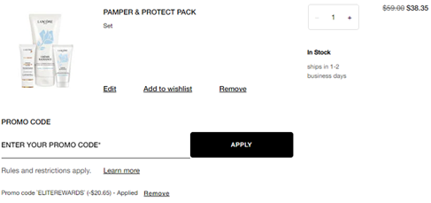 | 内容: | Lancome美国官网全场享无门槛65折,需要使用折扣码ELITEREWARDS。 这款Lanc?me兰蔻防晒+洁面套装,价值$88,原价$59,用码折后$38.35,美国境内免邮; 这款套装包含正装防晒30ml、正装洁面200ml+洁面小样50ml,使用这款居家和外出套装,随身携带您的日常护肤程序,让您在旅途中轻松准备和保护您的皮肤。