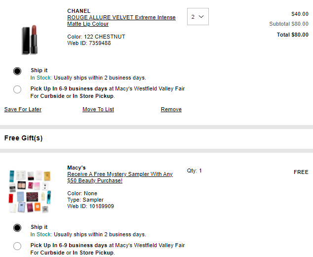| 内容: | 网站需在境外网络环境下打开! Macys梅西百货目前Chanel香奈儿磨砂黑管哑光唇膏122号补货,售价$40;美国境内满25美金免运费; 另外购美妆类产品满$50送美妆礼包,赠品自动加车; 香奈儿黑管122#超级好看的土棕色,毫无替代的颜色,可盐可甜,真的太特别了,很适合黄皮。